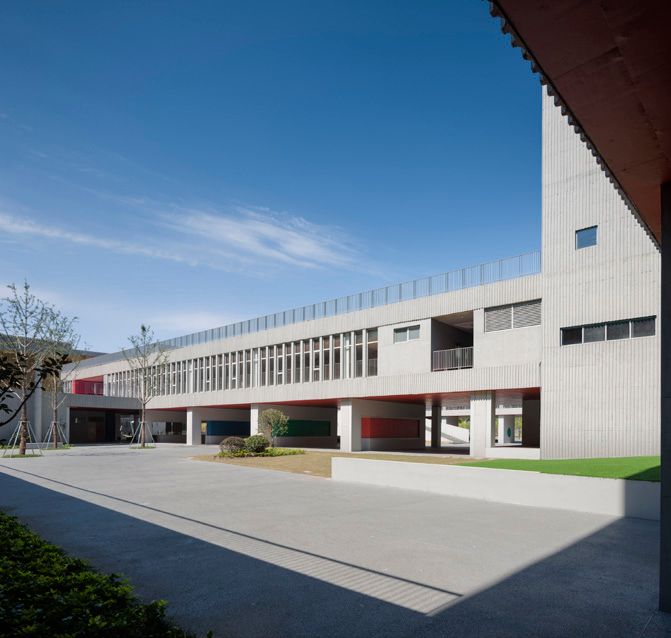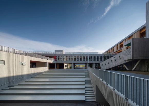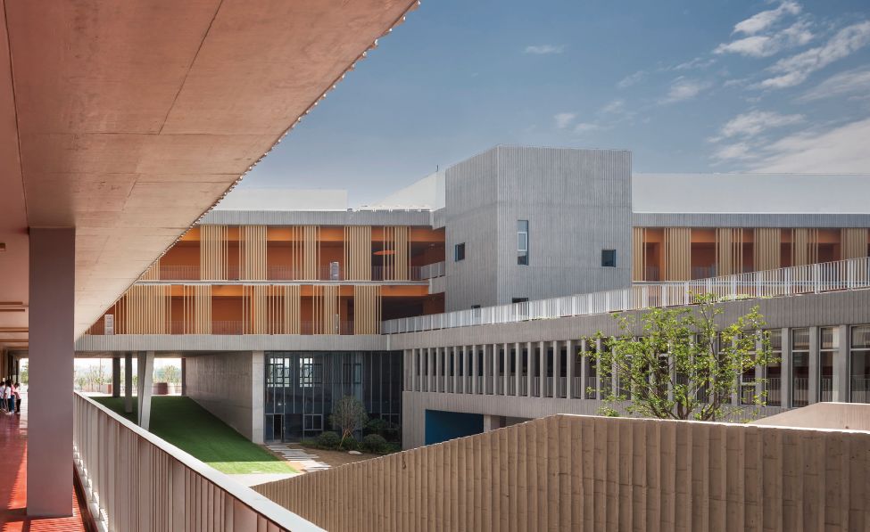 近期,社会各界对素质教育的重视为中小学校园的教学空间转型提供了契机。人们不仅认识到营造一个良好的整体校园环境对于学生健康成长与教育创新的重要性,并且开始重新审视常规教室之外的“非教学空间”的教育意义[6-7]。因而,如何提供更加开放多元的校园环境,将原先作为辅助功能的“非教学空间”转变为不受固定课程表限制的“新教学空间”,从而激发学生们的兴趣与创造力,进而实现从“(老师)知识传授”空间向“(学生)积极学习”空间环境的转型,是当前校园建设中无法回避的核心话题。九城都市近期完成的杭州师范大学附属湖州鹤和小学(以下简称“鹤和小学”,)是探索校园新型教学空间设计理念的一次有益尝试,体现了建筑师张应鹏对中国应试教育体制的抵抗与反思。该项目位于湖州市南太湖新区梅东片区,占地面积近5 hm?,总建筑面积约31 700 m?,是一所容纳48个教学班的公办小学。