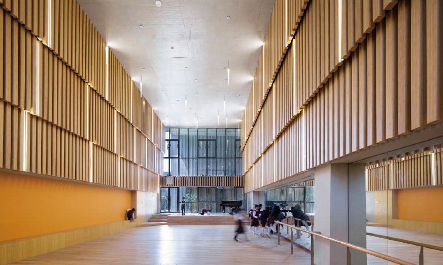 除了空间上对江南园林文化的因借,建筑师在地方建筑材料及构造方式上亦有所考量。湖州以“竹”闻名,建筑师自然将“竹”作为未来校园文化的主题。清水混凝土的实墙面采用了当地毛竹制作的模板,直径约10 cm~12 cm的毛竹被劈成两半,间隔3 cm反向钉入胶合模板中,脱模后清晰可见的竹节纹理丰富了清水混凝土坚硬冰冷的质感,类似江南民居饱经岁月沧桑后的斑驳墙面。建筑的三、四层外立面的竹木色格栅是对竹文化的再次回应。出于耐候性的考量,建筑师最终选择了竹木色的铝方通而非原竹,这种“去其形而存其意”的做法依然能很好唤起人们对“竹”的联想。从室内往外看,仿佛被漫无边际的竹海包围,强化了建筑的内向性,同时又开合有致,在恰当位置将远处山景纳入视野;从室外来看,疏密变化的竹木色格栅与后侧不规则的墙面窗洞相互掩映,演绎了江南文化的精致、柔雅与含蓄。除此之外,竹材料还应用于桌椅家具、吊顶格栅、门套、灯具及户外景观中,使整个校园更像是一个竹文化的低调秀场,学生们在学习之余,会不经意触摸和感知到家乡的特色文化,并为之自豪。