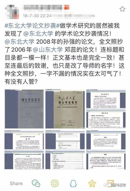 “两篇论文的标题、目录都一模一样,正文基本也是完全一致,甚至连最后的致谢,也只是改了导师的名字。”2018年7月30日,李乐在知网看到两篇近乎一模一样的论文。随后,他将发现公布在微博上,但一直并未获当事者回应。记者在中国知网找到了这两篇硕士学位论文,内容关于影视动画、游戏引擎。其中,山东大学软件工程专业邓蕊的论文率先发表,发表日期为2006年4月5日,论文题目为《基于游戏引擎的影视动画创作与实现》。该文有导师签名手迹。在邓蕊的论文发表两年后,2008年4月1日,东北大学软件工程专业孙强的论文也挂在了知网上。论文题目为《基于游戏引擎的影视动画设计与实现》。记者下载了两篇论文,通篇阅读后发现,孙强与邓蕊的论文标题仅差两字,但在内容上正如李乐所说,近乎“一模一样”,连最后的致谢部分,也仅有导师名称等微小差别(如图)。李乐曾在微博中表示,孙强“全文照抄”了邓蕊的论文,“这种全文照抄,一字不漏的情况实在太可气了,有没有人管?”两篇近乎“一模一样”的论文又被另一篇论文同时引用让李乐“震惊”的还有另一篇论文。在邓蕊的论文发表10年后,2016年7月15日,一篇题目为《基于游戏引擎的影视动画设计与实现》期刊论文也挂在了知网上,该文发表于《艺术科技》月刊,月刊主办单位为浙江舞台设计研究院有限公司。该文标题与孙强的论文标题相同,论文较短,篇幅只占该月刊杂志的一个页码。李乐发现,在该论文下方列举的4篇参考文献中,有两篇分别为孙强与邓蕊的上述近乎“一模一样”的论文。让李乐在微博中忍不住感叹,“09年那篇也是抄的,你心里没数?”记者在知网下载该论文后,发现该文确实将邓蕊与孙强的论文同时列入参考文献中。该论文作者为刘超亮与李亮,文末有作者简介。刘超亮,男,山东潍坊人;李亮,河南宜阳人。两人时为大连东软信息学院讲师。知网:校方或期刊方负责查重东北大学方面尚未答复“查重肯定查不过”,记者就两篇论文询问了知网方面,知网相关工作人员告诉记者,知网发表的期刊文章和学校论文等,都是期刊或学校方提交的,“期刊编辑和学校老师接收文章之前,肯定会查重。知网只是进行审核授权等程序,如果发现抄袭现象,可直接联系学校或期刊方”。公开资料显示,所谓查重就是将写好的论文通过论文检测系统资源库进行比对,检测论文的原创度。10月23日上午,记者联系到了邓蕊写作这篇论文时的指导教师。这位老师目前就职山东大学,他表示,知道这件事,“已经很多年了”。这位老师说,论文抄袭是国内外都存在的一种现象,如果要追究“抄袭”者的责任,应该和邓蕊进行联系。由于邓蕊已经毕业多年,这位老师已无邓蕊的联系方式。23日,记者就此情况向东北大学方面咨询,东北大学相关工作人员告诉记者,她将情况反馈后,会答复记者。但截至发稿前,记者未能等到东北大学方面的答复。此外,记者一直拨打孙强论文指导老师李丹程的办公电话,未能打通。记者查询了解到,2018年4月份,就有媒体报道过东北大学机械工程专业2008届硕士毕业生孙勇的硕士学位论文涉嫌抄袭的事情。校方在调查取证后,撤销了孙勇的硕士学位。“当时看了不少文章,也没有通篇阅读,没有太关注这个”