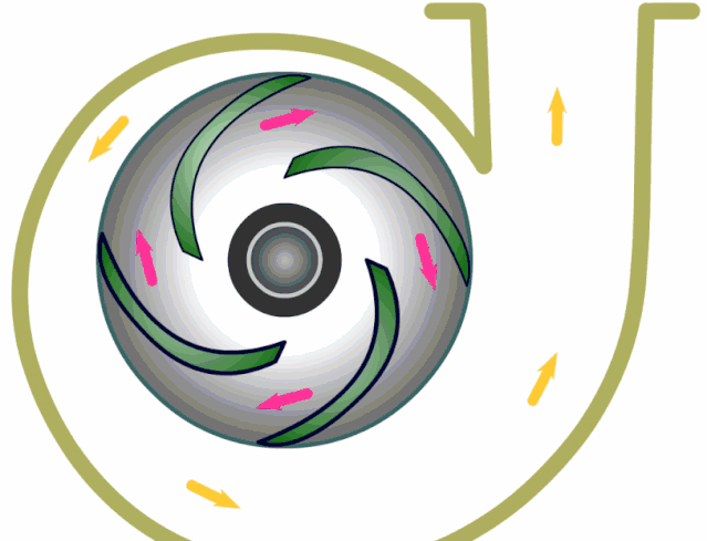 离心泵的基本部件是高速旋转的叶轮和固定的蜗牛形泵壳。具有若干个(通常为4~12个)后弯叶片的叶轮紧固于泵轴上,并随泵轴由电机驱动作高速旋转。
