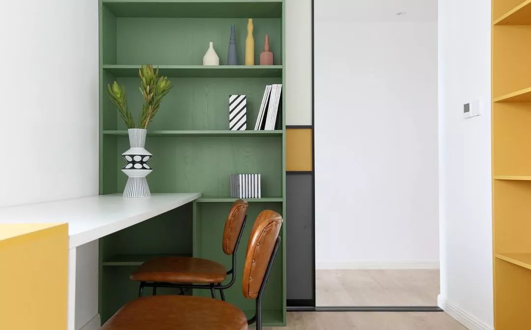 仍然是大面积的墨绿,沉静而文艺,半墙的白色木饰面背景增亮了整个房间的明暗度,黄色的床具平衡了空间色调,让人一夜好眠。