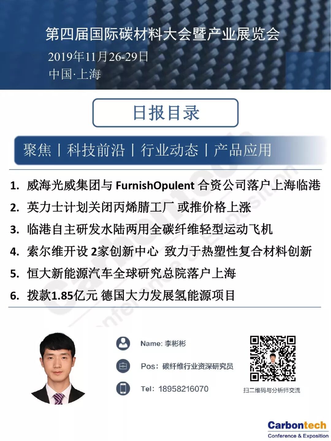 10月25日碳纤维日报| 英力士计划关闭丙烯腈工厂、临港自主研发水陆两用全碳纤维轻型运动飞机、恒大新能源汽车全球研究总院落户上海