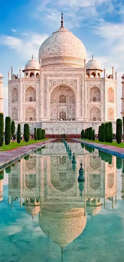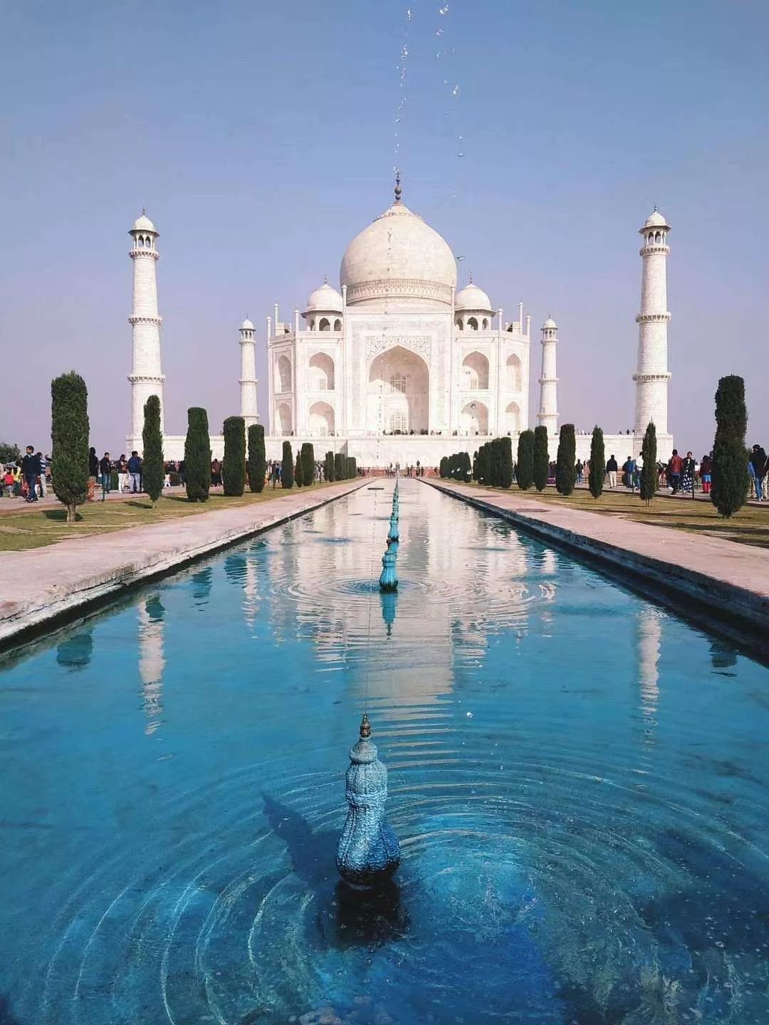 陵墓的正前方有一个十字形水池,中心为喷泉。每当天空晴朗,万里无云的时候,水池中就会映出宫殿的倒影,就像有两座泰姬陵互相辉映,真是美妙极了。