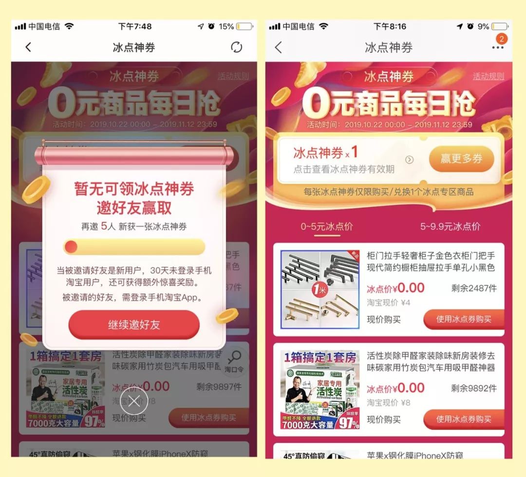 2、每邀请1名指定用户(如手淘新用户、长时间未访问用户等),有机会获得一张冰点神券;