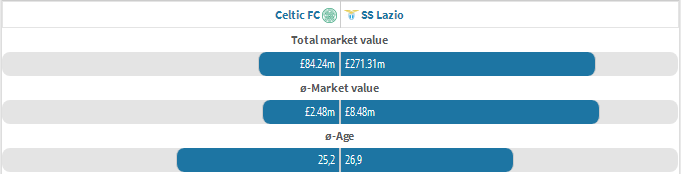凯尔特人总身价8424万英镑,拉齐奥总身价2.71亿英镑。