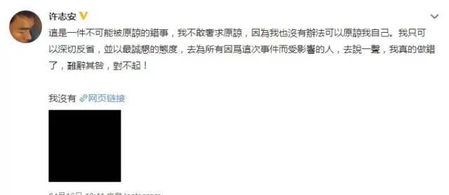 在16号晚上,许志安也发文,“这是一件不可能被原谅的错事,我不敢奢求原谅,因为我也没有办法可以原谅我自己。我只可以深切反省,并以最诚恳的态度,去为所有因为这次事件而受影响的人,去说一声,我真的做错了,难辞其咎,对不起!”