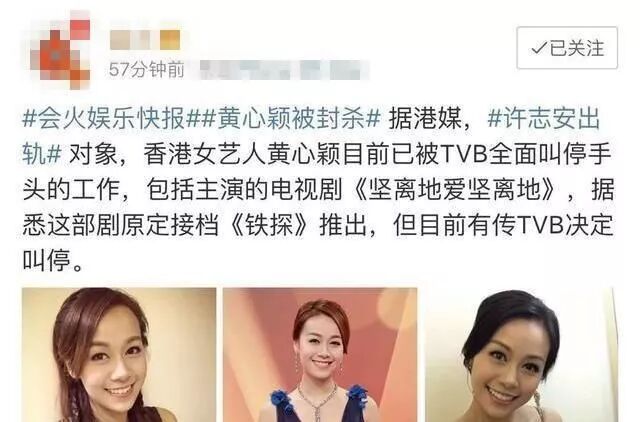 而许志安的出轨对象黄心颖,已经被TVB全面叫停手头工作,包括她的影视剧也都受到了影响,演艺事业面临巨大危机,想必感情生活也就到此为止了。早知如此,何必当初呢?