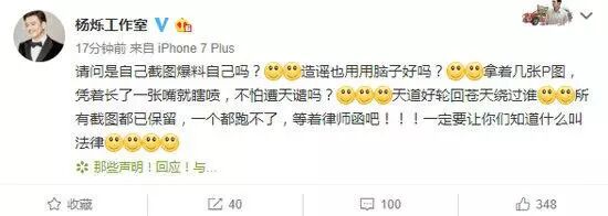 张丹峰的瓜还没有吃完,“小包总”杨烁又被曝出轨,还有所谓的聊天记录曝光,二人一夜安眠,随手就转账一万块,让对方买零食吃。关于杨烁出轨的事情持续发酵。紧接着杨烁工作室发文澄清,称聊天记录造假,等律师函吧!更是一连串的反问,很硬气。