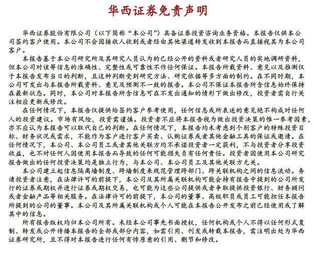 在任何情况下,本订阅号所推送信息或所表述的意见并不构成对任何人的投资建议。华西证券及华西证券研究所也不对任何人因为使用本订阅号信息所引致的任何损失负任何责任。