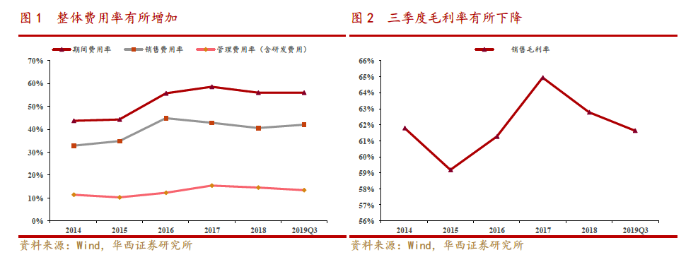 公司2019年三季度营收增速3.3%,增速略有放缓。公允价值变动净收益为-0.3亿元,对公司三季度净利润形成了重大的影响,但是不影响长期趋势。同时,三季度公司整体费用为9.96亿元,同比增加8.3%。其中销售费用为7.10亿元,同比增加7.4%;管理费用为2.31亿元,同比增加8.7%;研发费用为0.40亿元,同比增加22.4%;财务费用0.15亿元,同比增加10.1%。