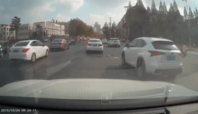 直至一辆车辆挡住去路,白色轿车才得以停下。