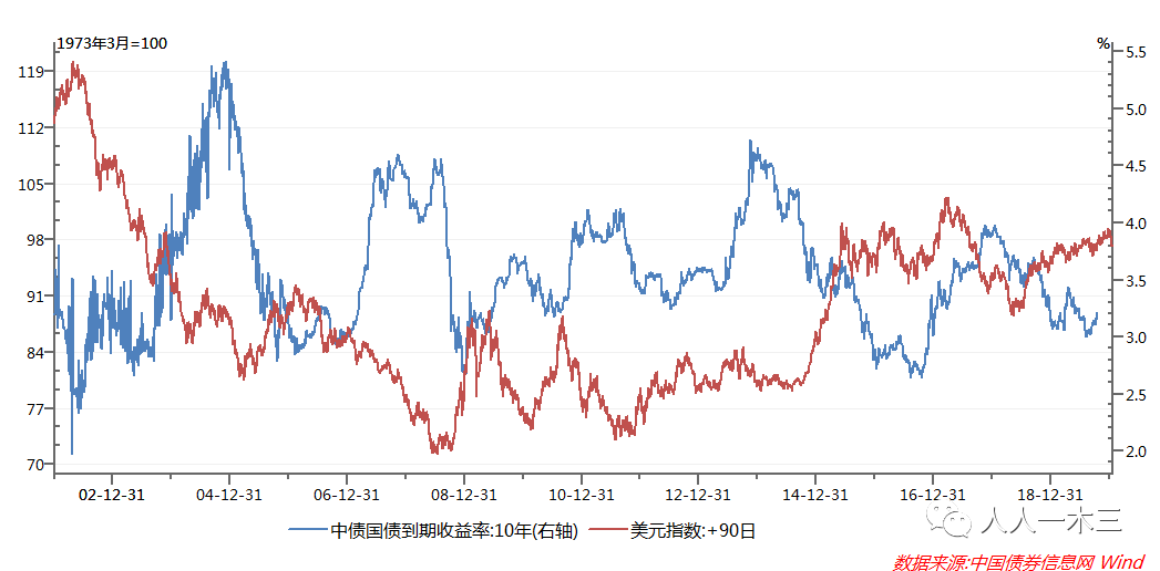 美元指数与国债收益率的相关性,其中可能存在的原因,一方面,在于全球经济的共振现象明显(徐小庆总之前好像讲过这个,主要是中国体量在世界经济体占比大,增速快。);另一方面,最近在看计量,总觉得美元指数或是国内经济基本面的工具变量IV,与国内基本面相关度较高(美元指数体现的是美国相对于非美国家,主要欧洲的表现),美元指数与中国国债利率没有直接关系,即被解释变量(中国国债)与工具变量美元指数无直接关系,模型看似不会存在内生性,而美元指数与决定中国国债基本面因素是相关的。这个可以再梳理一下其中的逻辑。