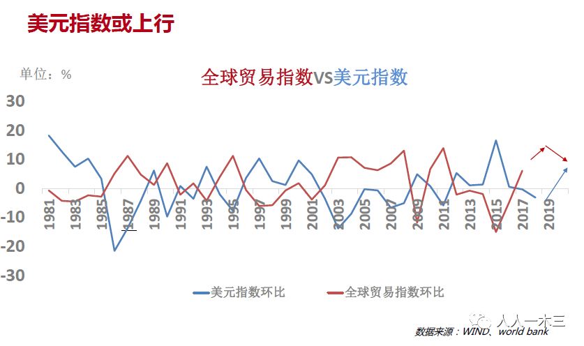 去年年度策略会的时候,我画了下面这个图,全球贸易下行的背景下,美元指数或呈现抬升。