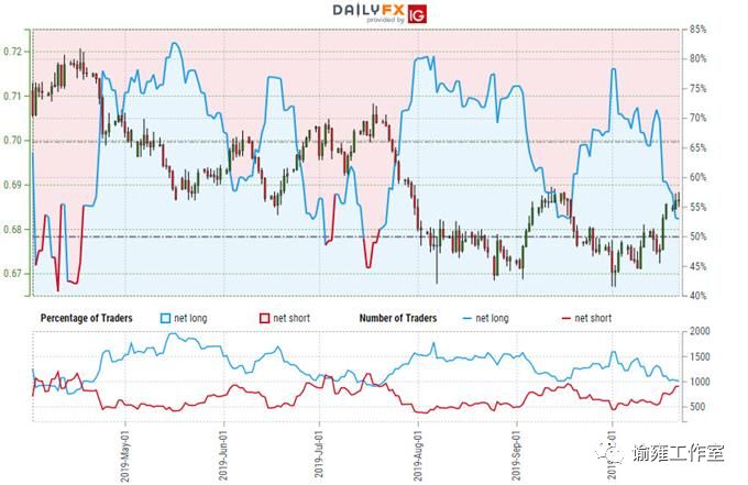 IG客户情绪报告显示多数散户看空澳元/美元,空头与多头比为1.01:1,多头头寸较昨日减少0.2%,较上周减少22.97%,空头头寸较昨日增加14.56%,较上周增加91.75%,作为一个反向指标,散户看空暗示汇价可能会继续上涨,净空头仓位进一步增加表明汇价上行的可能性更大。