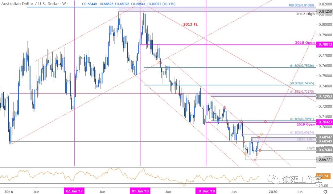 笔者在9月底的澳元/美元周线技术分析文章中总结指出,若澳元/美元想要维持住始于9月以来的上涨趋势,那么10月开盘就必须企稳在关键支撑区间0.6745-0.6675上方,若能突破始于2018年6月以来的趋势线则暗示汇价在第二季度录得了重要低点(0.6677),后市有望大幅上行。10月开盘,澳元/美元自8月录得的低点反弹后一如笔者预期持续上涨,目前正在测试始于2018年6月以来的趋势线/9月高点0.6895。