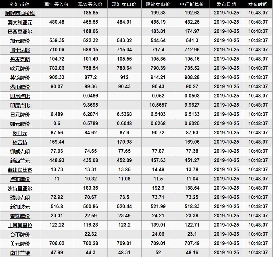 ● 中国银行外汇牌价表最新查询(2019年10月24日)