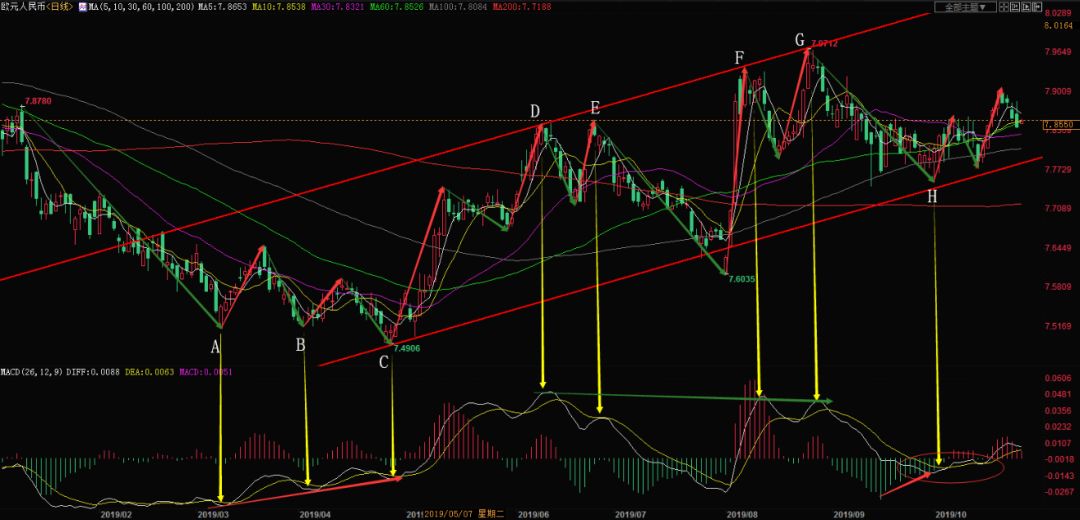 此后,欧元兑人民币汇率持续走高,D点触及通道线上轨后回落,E点虽然新高,但是指标同步下行,这是典型的顶背离信号。汇价随即快速回落,同样的情况还出现在F点和G点,欧元兑人民币汇率也向H点回落。