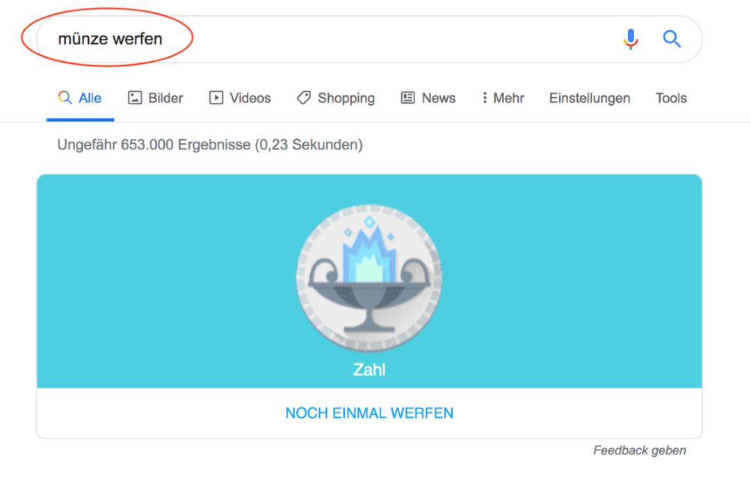 谷歌浏览器里还可以自动生成掷骰子或扔硬币的点数。在浏览器里输入"Würfel werfen"或“Münze werfen”即可。