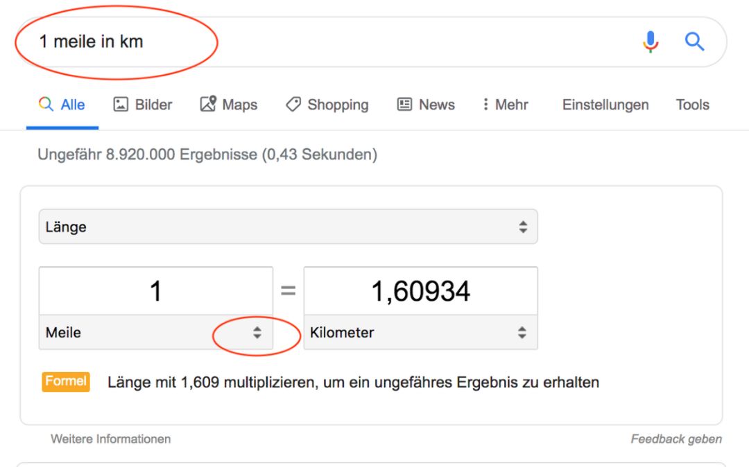 除了计算器,谷歌计算器还可以做单位换算。在搜索栏里输入比如“1 Meile in km”的指令,类似地,在搜索结果的最上方会直接显示换算结果。