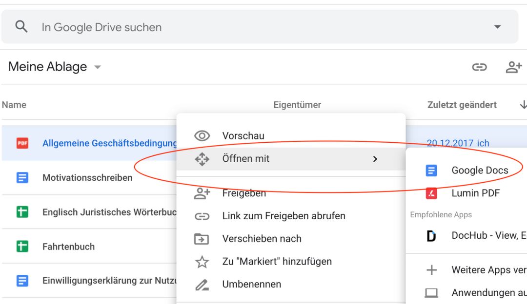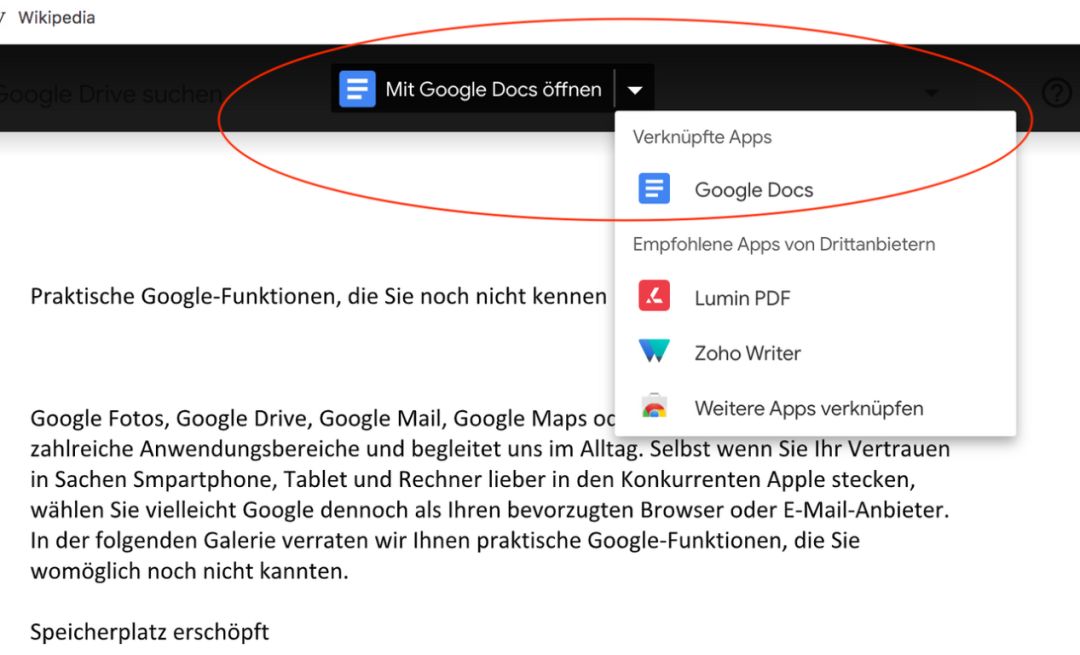 如果想把DOCX, PPTX或者XLS后缀的文件在云盘里保存、打开和编辑,我们可以非常简单的通过拖拽上传到谷歌云盘里。上传过的文件首先会以Microsoft-Office的兼容模式打开,点击上方中间的“Mit Google Docs ?ffnen”,就可以直接在Google Docs里编辑了。