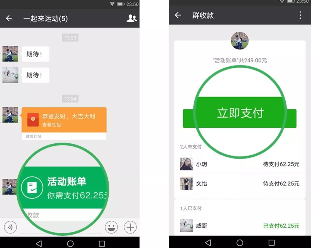 ● 成员可点击活动账单,查看消费情况,所需收款金额已根据勾选的参与人数,进行自动AA制平分,点击「立即支付」即可进入正常付款流程。● 收款发起人可通过活动账单查看收款情况,谁已付款,谁还没付,一目了然。