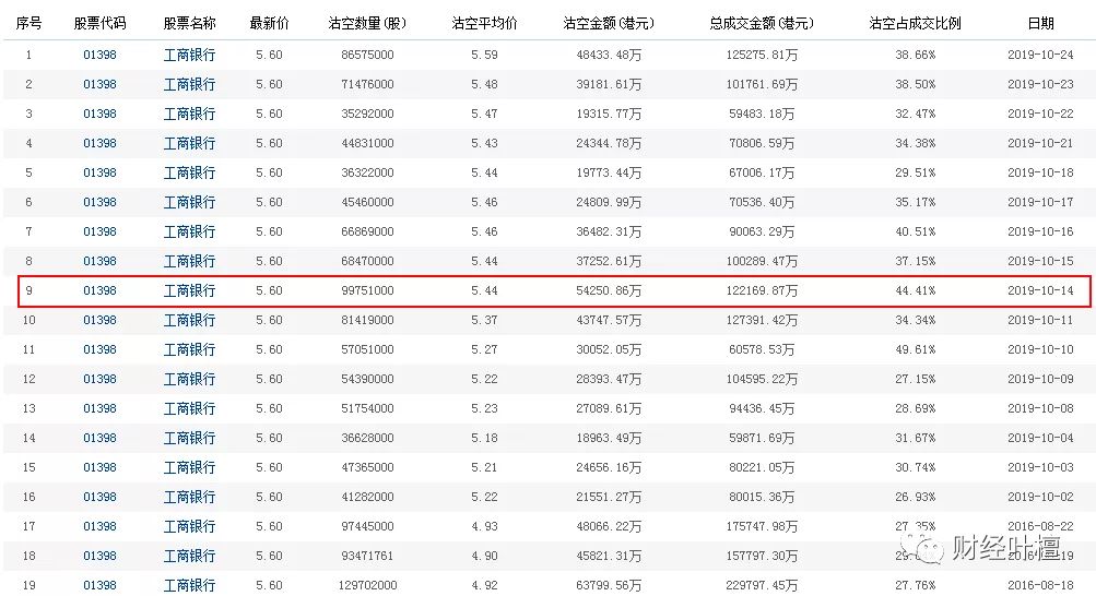 内银股在A股和H股市场一路上涨,在10月的震荡行情中走出一轮漂亮的趋势!在这个时候,政策和大资金不可能打压银行股,更不可能主动做空大银行股。在一片红火的行情背后,资本市场却发生了一件非常重要却不为人知的事情,工商银行H股的做空仓位处于空前高位!查询工商银行港股(01398)沽空记录,从10月以来,工商银行的沽空占比迅速攀升,2019年10月14日,沽空占成交比达到了史无前例的44.41%!