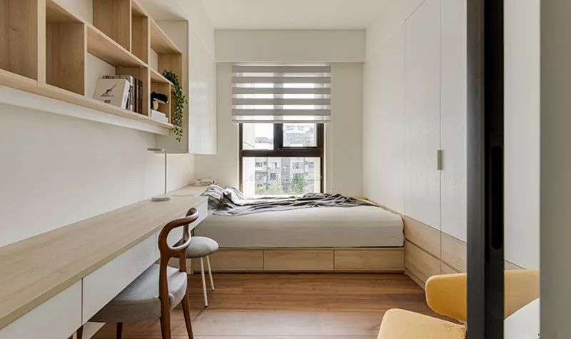 将床设计成榻榻米样式,书柜、衣柜都与榻榻米融为一体;也可将衣柜设计的大一些,把床嵌入衣柜中,书桌放置在衣柜一侧,此种摆放形式能够节省更多空间。