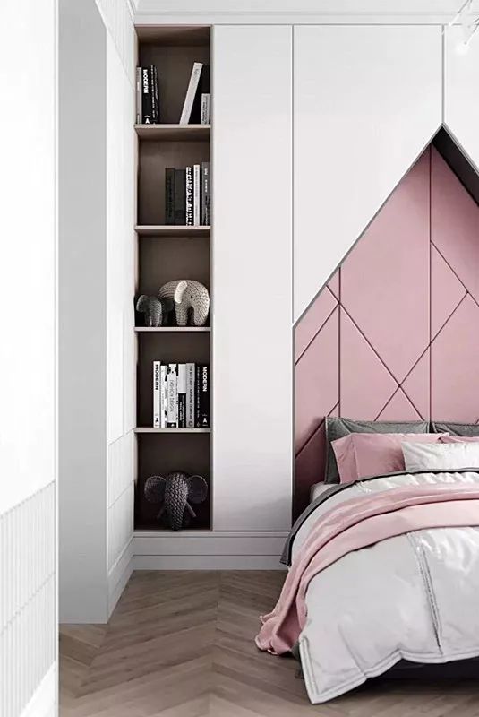 如果卧室中的墙体较厚,可以利用在墙上打造一个壁龛,再安装几块隔板,就能起到收纳的作用。