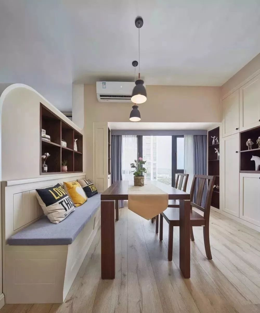 实木餐桌椅搭配卡座设计,不仅节省空间,还可以满足更多人用餐时的需求。