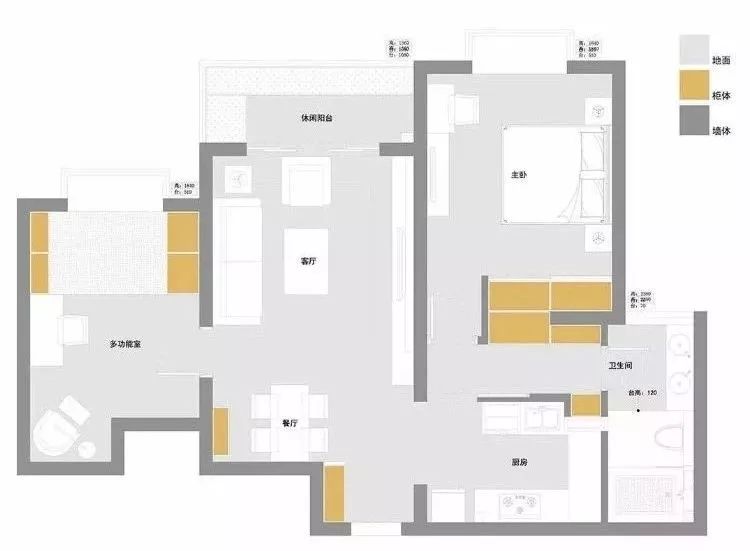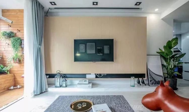 客厅的电视背景墙是做上了木色的柜子,底部留空的部分可以放下电视盒子、路由器等。客厅和阳台之间用窗帘作为隔断,阳台通铺防腐木,加入绿植也不影响洗衣晾晒。