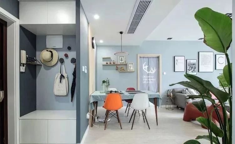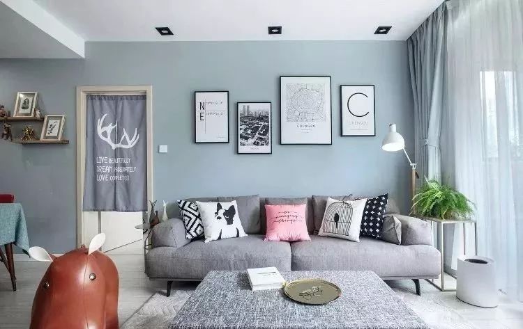 餐厅和客厅之间有着通往次卧的门,加上一个小帘子,显得更加文艺。沙发背景墙上点缀几幅简单的挂画,灰色的布艺沙发和绿植也很有北欧风的感觉。