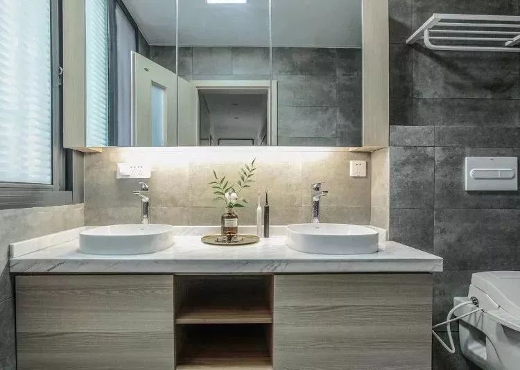 卫生间的空间比较宽敞,洗手台被改成了双人位的,这样平时洗漱的时候会方便一些,上方的镜柜底部加入了藏光设计,让卫生间更显宽敞明亮。