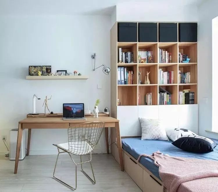 次卧是作为书房来使用,榻榻米床结合书柜,侧方摆放一个长书桌,当工作累了之后,也可以直接躺下来休息一下。