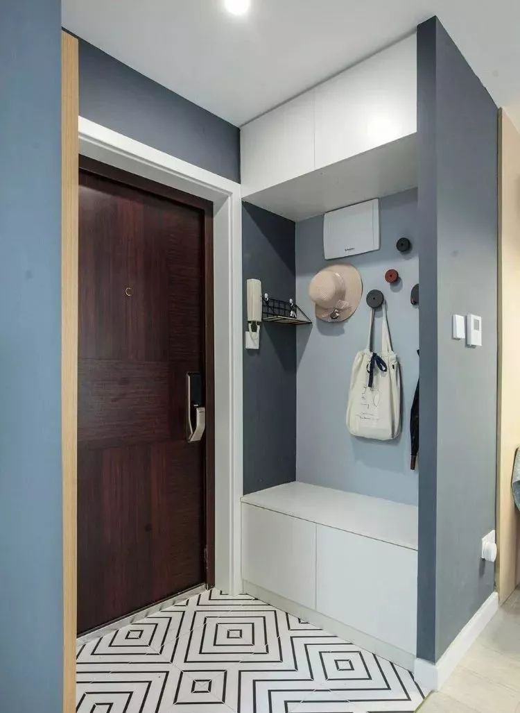 入户玄关的面积比较小,做了换鞋凳搭配挂衣钩的设计,更方便日常更换鞋子。玄关地面的几何瓷砖让人感觉更有设计感。