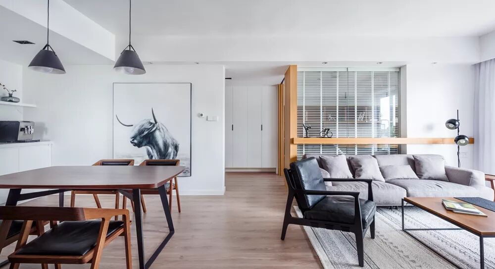 ▲客厅沙发墙以木质+玻璃隔断的设计,后方就是一个小书房,整体采光打通的空间,显得更加时尚自然。搭配一张灰色的布艺沙发,一道木质装饰横穿整个沙发墙,让空间显得更加自然端庄。