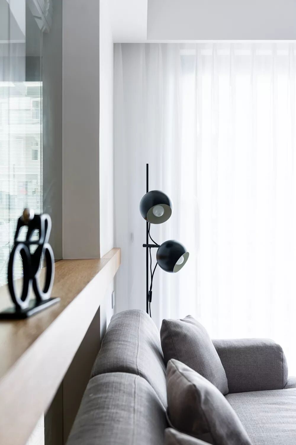 ▲这道横穿沙发墙的木方,上方摆着小摆件,增添了空间的精致感。