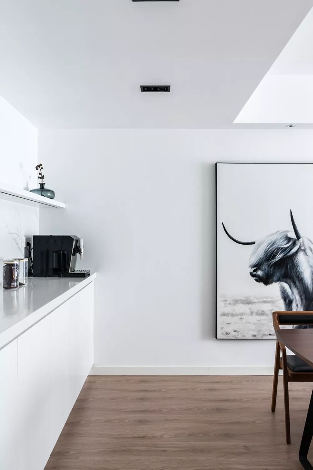 ▲侧边是一个深木色的成品餐边柜,里侧则是一个雅白的定制餐边柜,装成一个西餐操作台,整体优雅时尚的布置,让空间充满现代舒适的稳重气质。
