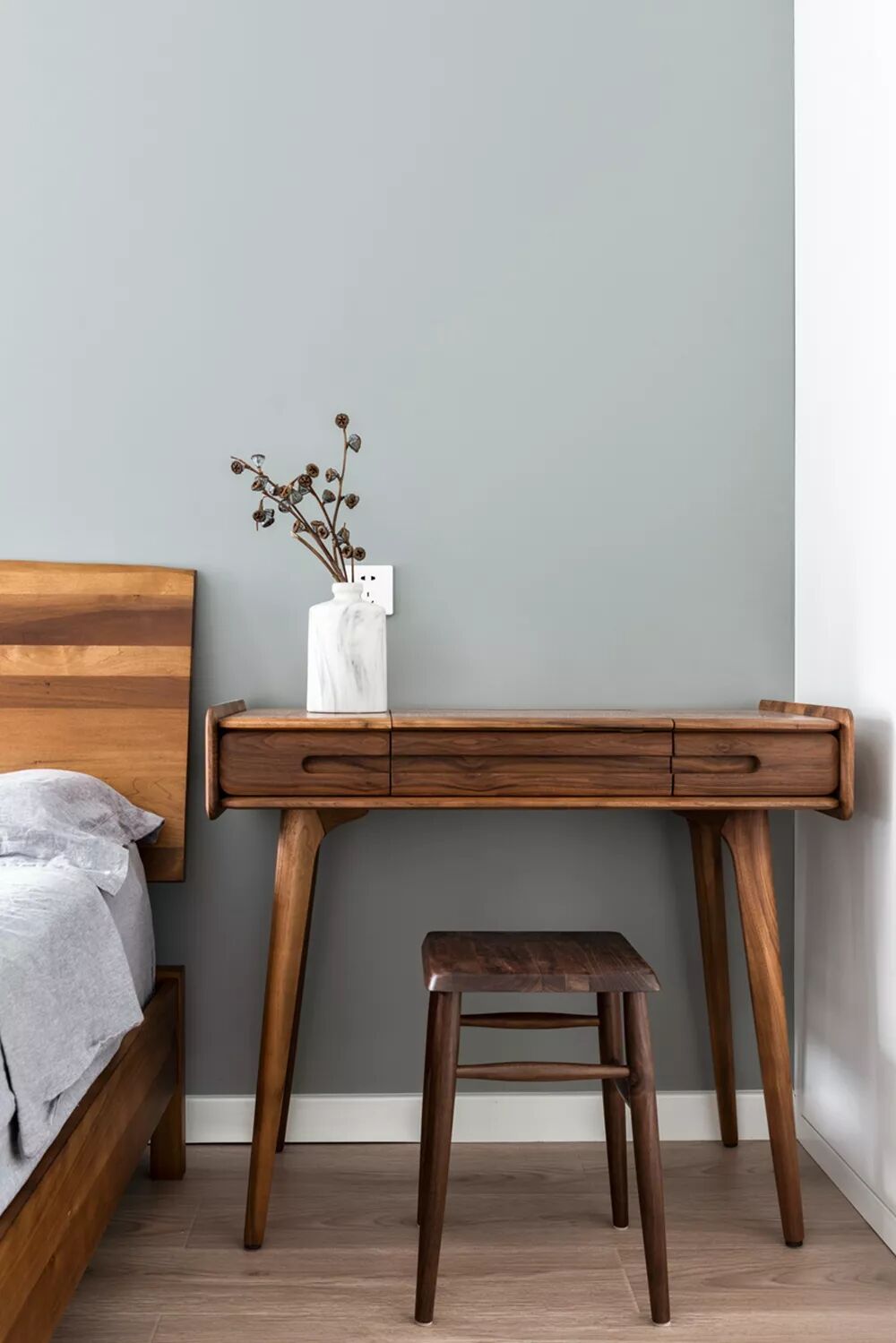 ▲床头梳妆台与桌椅,都是深木色的,梳妆台上放一个端庄的花瓶,插上干花呈现出禅意优雅的大气感。