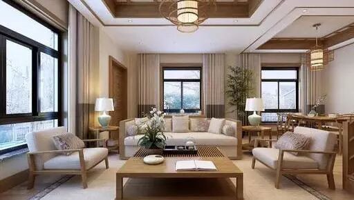 新中式风格十分追求空间的层次感,在一些地方需要做出隔断来分隔各个功能性空间,一般采用垭口、博古架、屏风、窗棂等隔绝视线,实现空间的层次分隔,体现出中式家居的层次美感。新中式风格客厅的墙面色彩搭配多以深色为主,色彩浓重而成熟,体现一种成熟稳重的气质。