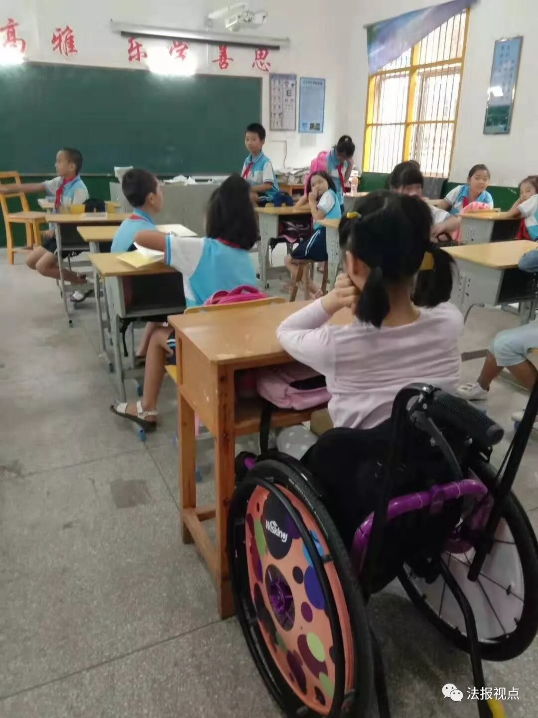 坐着轮椅重返课堂父亲全程陪读