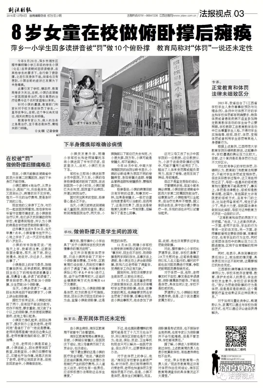 2016年12月6日,本报以《8岁女童在校做俯卧撑后瘫痪》为题报道了萍乡市湘东区腊市镇明塘小学三年级学生小琪(化名)的不幸遭遇:早读期间因领读错误,在其他学生的要求下,她自行做了几个俯卧撑。做完俯卧撑后,小琪出现身体不适,随即被送医,但下半身瘫痪的结果,成了大家不得不面对的现实。 3年来,小琪的病情并未得到很好的改善,脊柱侧弯严重,导致肋骨变形,双脚也出现萎缩。为了治病,家里已债台高筑。因未能与当地教育部门就小琪在校受伤该如何处理达成一致,无奈之下,小琪的父母起诉到法院,希望通过法律途径争取应有的权益。