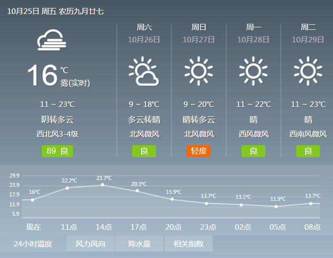 阴转多云,11~23℃,西北风3-4级,空气质量良好。