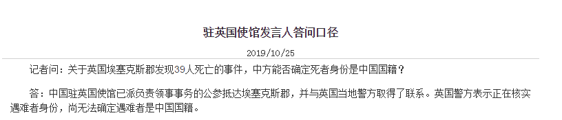 据中国驻英大使馆消息,使馆已派负责领事事务的公参抵达埃塞克斯郡,并与英国当地警方取得了联系。英国警方表示正在核实39名遇难者身份,尚无法确定遇难者是中国国籍。