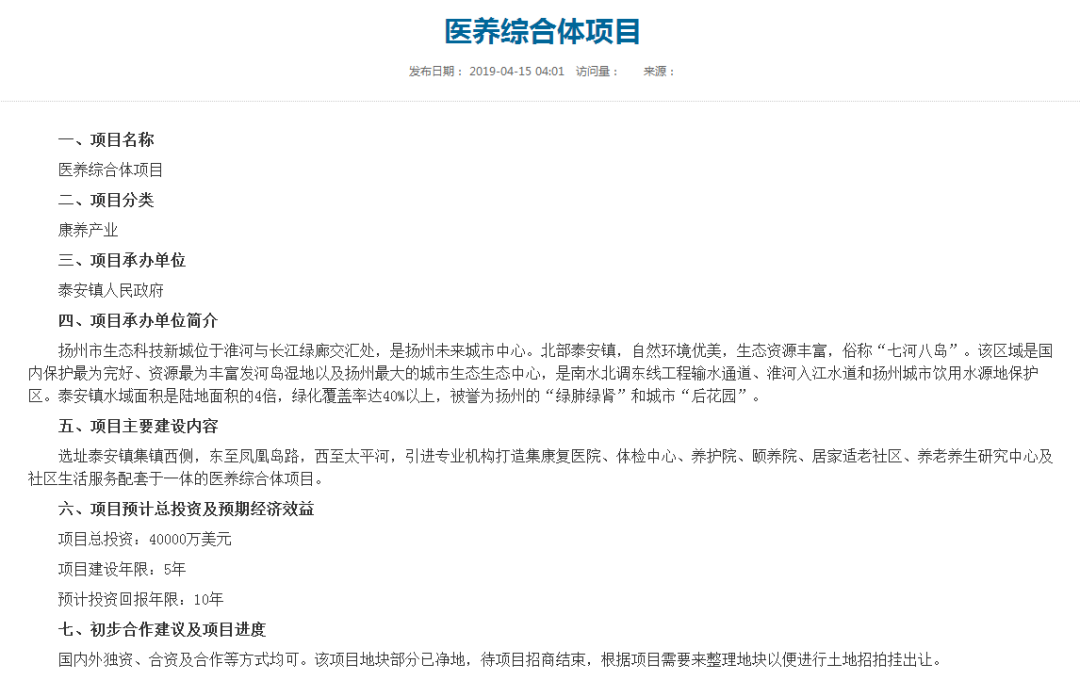 建设内容:打造集康复医院、体检中心、养护院、颐养院、居家适老社区、养老养生研究中心及社区生活服务配套于一体的医养综合体项目。