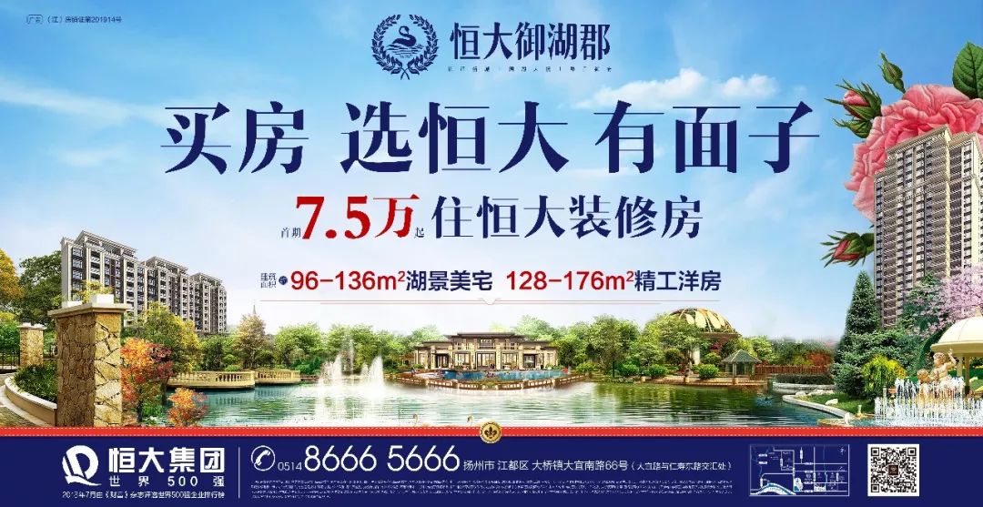 免责声明:本项目备案名为恒悦华府。推广名为恒大御湖郡,商品房楼号、房号由政府相关部门初步确定,项目最终名称及商品房楼号、房号以政府相关文件确认为准。本广告相关内容、图片是对项目所做的示意表现,仅供参考。最终以政府有关部门批准的文件、图则为准。经政府批准的详细规划已在销售现场公示,敬请查看。后续因规划及设计方案调整导致信息变化的内容,我司将按照政府要求进行公示。本广告对项目的周围道路规划、环境、交通、公共设施、各种产品及文字介绍,旨在提供相关信息,不意味着本公司对此作出了任何承诺。本项目的教育配套以政府规划为准,其中大桥镇中心小学(直线距离约0.8公里)、大桥镇中学(直线距离约1.3公里)、大桥镇高级中学(直线距离约1.3公里),在此不承诺入学事宜,学校配套仅供购房者参考,业主是否符合入读条件以政府文件为准。本项目临近开元寺国家3A级景区(直线距离约1.5公里),星北湖公园(直线距离约1.7公里)。项目内部规划人工湖约2500m?。世界500强出自2018年7月由《财富》杂志评选的企业排行榜。关于万亿恒大说明:截止2018年上半年,恒大总资产达1.77万亿元,故称“万亿恒大”。相关内容如有更新,请以最新资料内容为准。本广告为要约邀请,买卖双方的权利及义务以双方签订的《商品房买卖合同》为准。