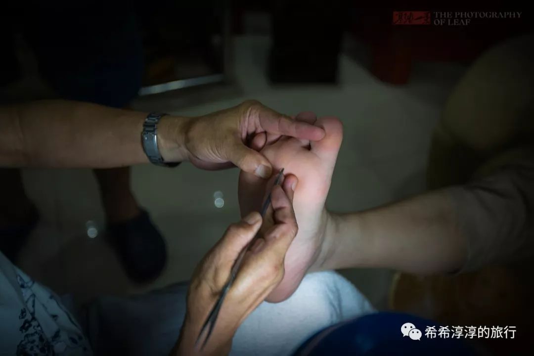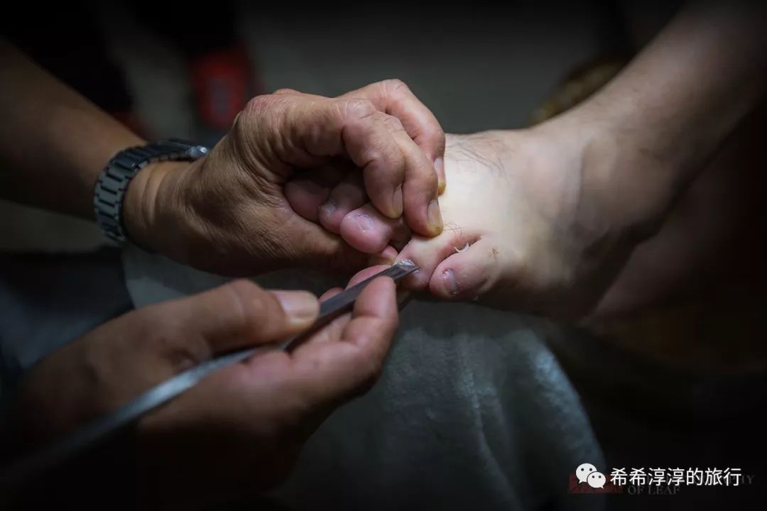 扬州修脚刀,由技而医,很多医院无法根治的脚上疾病,在扬州修脚师傅的巧手下得到了根治,可见其技艺的精湛。在修脚前,客人先需泡脚。泡完后陆师傅拿起一块毛巾,仔细给客人擦干脚。光是这擦脚,这里面都包含了很多的手法。