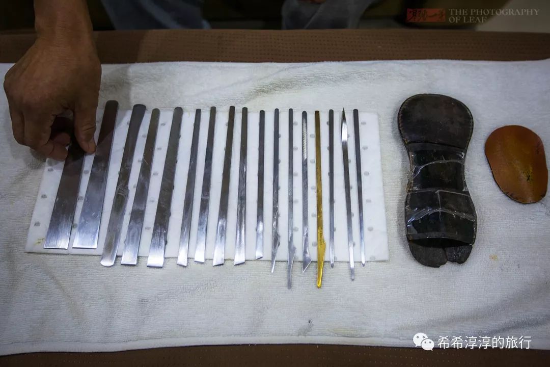 陆师傅先是拿出一块看着有些年头的毛巾,平整的铺在桌上,拿后拿出一个黑色的真皮小包,里面装着各式的刀。他一件件小心的拿出来,放在毛巾上,整整18把刀。而这些刀全部是用来修脚,每个部位,每种修法,都会用到不同的刀。