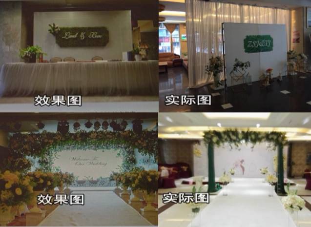 田女士:舞台设计完全不一样,红毯长度不够,路引灯只有两边各三个,干冰机、泡泡机、放音乐的电脑都没有,都是临时凑出来的。我要求全额退款,不需要他过多赔偿。