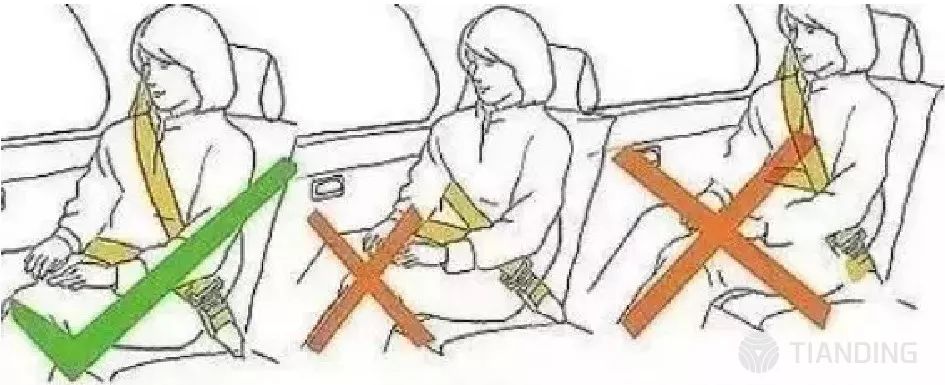 正确佩戴安全带时,肩带应该跨过胸腔,腰带应该紧贴髋骨。这样做主要是为了使事故时的冲击力作用在我们的骨骼上而不是我们柔软的内脏器官上。
