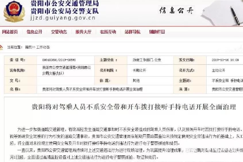 从11月1日起贵阳将对驾乘人员不系安全带和开车拨打接听手持电话开展全面治理